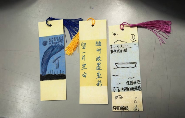 书签制作环节将活动推向高潮。同学们结合所读内容与个人风格,充分发挥想象力与创造力,精心构图、认真书写、细致装饰。大家专注勾勒线条、搭配色彩,将书中金句、人生感悟与创意设计融入方寸之间,一件件风格各异、寓意深刻的书签作品陆续完成。现场氛围温馨而热烈,处处洋溢着书香与青春气息。