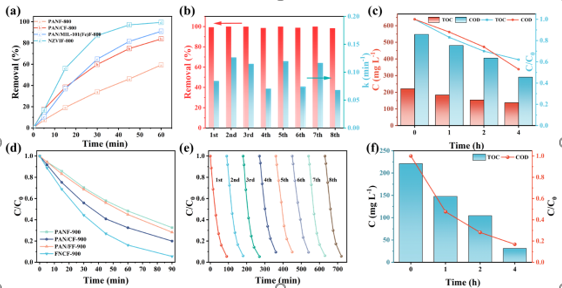其次,为了彻底解决金属离子浸出、容易产生铁泥、稳定性较差等弊端,制备了非金属基电极材料FNCF-900。FNCF-900同样表现出了优异的非均相电芬顿降解性能,在90 min内可去除95.5%的SCZ,8次循环后降解效果没有明显的变化。将其应用于处理制药废水,表现出了较为突出的矿化和杀菌性能,在4 h内,TOC和COD分别降低了86.1%和83.7%,且在1 h内,灭菌效率高达95.2%。