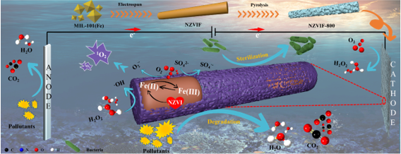 本篇优秀学位论文通过结合静电纺丝和热解工艺成功制备了纤维结构电极,其中,以聚丙烯腈(PAN)、MOF、碳黑制备而成的金属有机框架衍生纤维电极NZVIF-800及以PAN、聚四氟乙烯(PTFE)、碳黑合成的非金属基纤维电极FNCF-900表现出了优异的有机物降解催化活性。电极呈现高比表面积多孔纤维结构,且活性组分被碳层包裹,形成限域效应,增强了电极的稳定性。