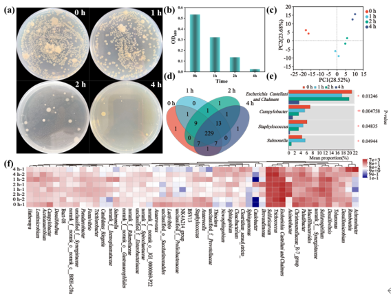 首先,NZVIF-800电极在非均相电芬顿(heter-EF)体系中表现出良好的有机物降解催化活性,其中塞克硝唑(SCZ)在60 min内完全降解,且在8个循环后降解率无明显变化。重要的是,NZVIF-800电极对实际制药废水的净化也非常有效,在heter-EF反应4 h后,TOC和COD去除率分别达到38%和47%。与此同时,采用NZVIF-800电极的heter-EF系统对废水表现出强大的灭菌能力,从菌落状况、OD600值和Illumina MiSeq测序平台分析可以得出,该heter-EF系统在4 h内对制药废水的灭菌效率高达95%
