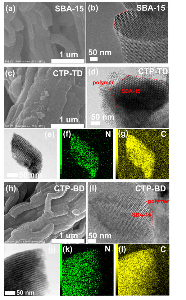 为强化电子供应,采用希夫碱缩合反应合成了二苯甲酮功能化聚合物(COP-BPN)。FT-IR、13C NMR以及XPS证实了C=O的存在。N2吸脱附表明所制备的聚合物均为无定形网络且比表面积相近,排除了形貌对催化性能的干扰,为后续性能差异归因于电子结构奠定了基础。为解决O2和H⁺供应不足的问题,以SBA-15为载体,采用气相辅助固相合成法,在三氟甲烷磺酸蒸气催化下通过氰基三聚反应制备三联苯功能化共价三嗪聚合物(CTP-TD)。FT-IR(1506、1369 cm-1)和13C NMR(172 ppm)证实了三嗪环特征信号的出现。为实现H2O2原位利用于丙烯环氧化,将三聚氰胺-三聚氰酸超分子自组装前驱体在氩气中550℃热解制备了N3C空位修饰的氮化碳(CN-Ar)。XPS定量分析表明,表面N/C比从1.3498降至1.1686,N2C/N3C比值从1.83升至3.67,证实N3C空位的形成。最后,为深度活化H2O2转化为Cl2•−活化C-H键,以噻吩-2,5-二腈为单体,同样采用气相辅助固相合成法合成了CTP-S。FT-IR和13C NMR证实了三嗪环的形成及噻吩结构的保留(噻吩碳信号在132、147 ppm)。