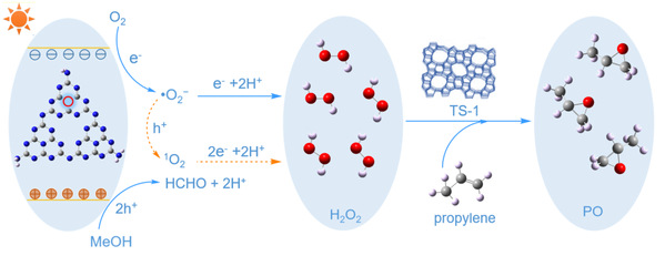 为了满足HPPO的要求(防止环氧丙烷开环,同时有效获得H2O2),利用氩气热解和超分子自组装前驱体的协同作用,一步制得具有N3C空位的氮化碳用于高效光合成H2O2。在光照和O2环境下,串联体系可以高效(5515 μmol·g-1·h-1)和高选择性(99.1%)的生产环氧丙烷(PO)。机理研究表明,N3C空位的引入显著促进了光生电子空穴分离,增强了H+和O2的吸附。涉及•O2−和1O2的双合成路径促进了H2O2的高效生成(5775 μmol·g-1·h-1,5775 μM·h-1)。此外,兼容的溶剂体系(甲醇/水)同时促进了H2O2和PO的生成,有效避免了H2O2的分离纯化。