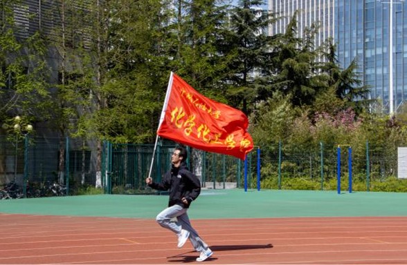 在启动仪式的最后,四位充满热情的志愿者高举着院旗,共同接力完成了本次活动的第一个四百米路程。