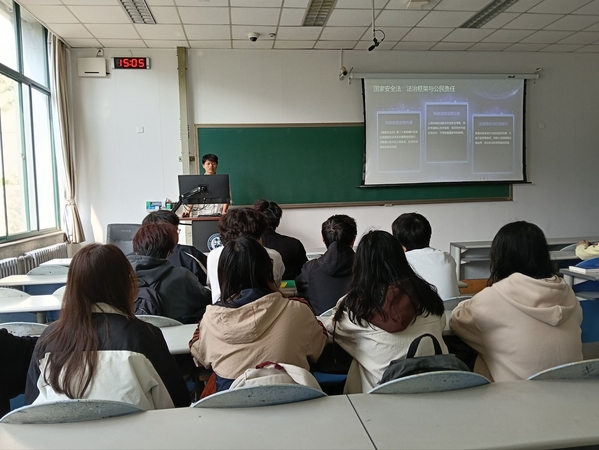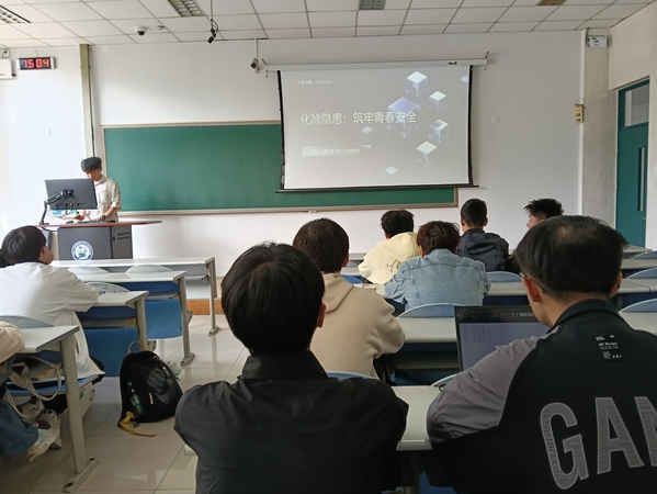 4 月17日,应化2503团支部在南堂楼104教室开展“‘化’除安全隐患,筑牢 青春防线”主题活动,以化学实验室安全科普暨国家安全知识竞赛为载体,推动 专业学习与国家安全教育深度融合,强化支部成员的科技安全意识与责任担当。 本次活动由团支书陶新豪主持,全体成员参与。