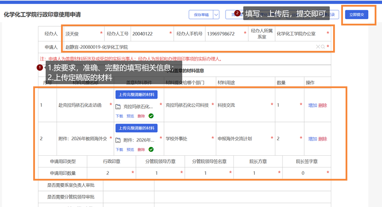 4. 在“用印审批表”标“*”的为必填项。按要求填写完后,将需要盖章的材料上传至系统。完成填写后点击“立即提交”。