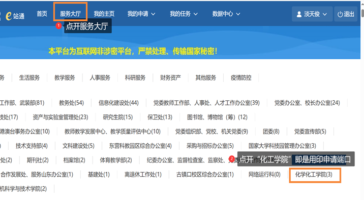 或 “e站通”页面,打开“服务大厅”----点“太阳成集团tyc33455”即看到用印申请端口