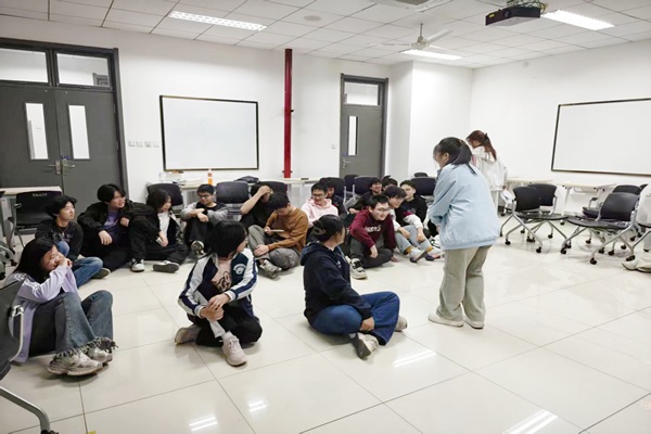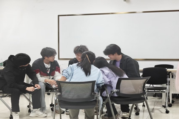 活动伊始,现场播放带有节奏感的音乐,迅速调动起了班级成员的积极性。“口香糖粘哪里”游戏中班级成员们跟随口令快速反应,互相配合、自由互动,现场笑声不断,原本略显拘谨的氛围瞬间被打破,班级成员们在欢乐的肢体互动中消除陌生感。随后在“超音速传话”游戏里,班级成员们依靠手势、表情、肢体动作默契传递信息。信息在层层传递中不断变化,引得全场阵阵欢笑。 在“盲哑人排队”体验活动中,昏暗的视野与无声的环境,让成员们沉浸式体会沟通障碍的难处,真切感受信任、包容与换位思考的重要意义,现场互助氛围浓厚。 “骗子,骗子”交流环节中,班级成员们围坐在一起,轮流讲述真假交织的生活趣事与日常点滴。班级成员们认真倾听、积极提问、趣味猜测,在轻松有趣的交流中,发现身边同学不为人知的可爱一面,打破刻板印象,拉近心与心的距离。不少成员主动分享内心感受,真诚表达想法,现场氛围温暖治愈。